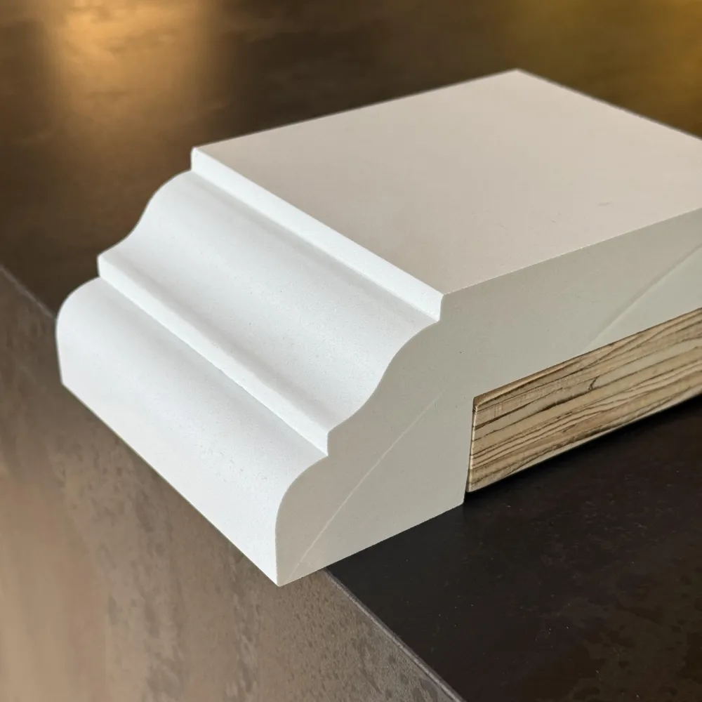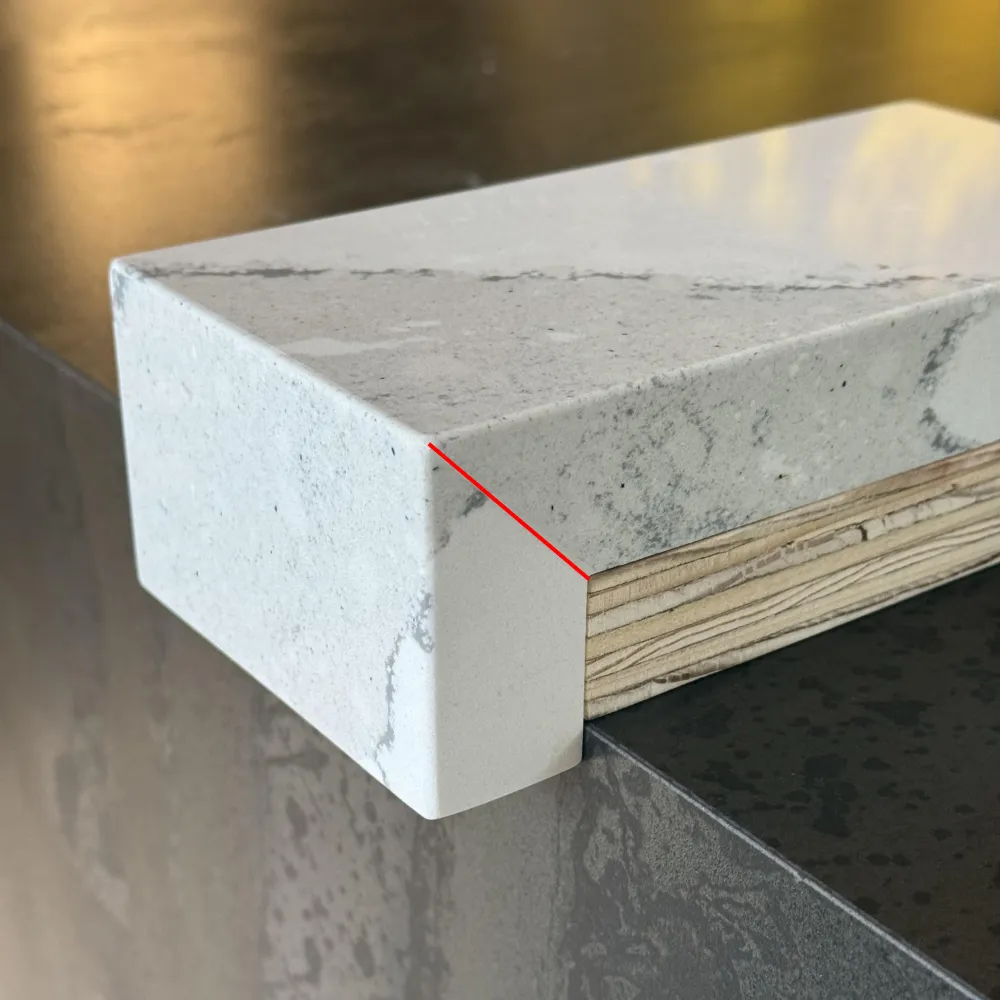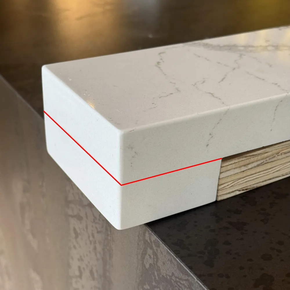A laminate or sandwich edge on a countertop refers to a fabrication technique used to make the countertop appear thicker and allow the fabricators to essentially carve out more decorative edge profiles. A laminate edge is made by gluing an additional strip of quartz or natural stone under the edge of the countertop. This edge is not suitable for porcelain products. Porcelain is not through-body.