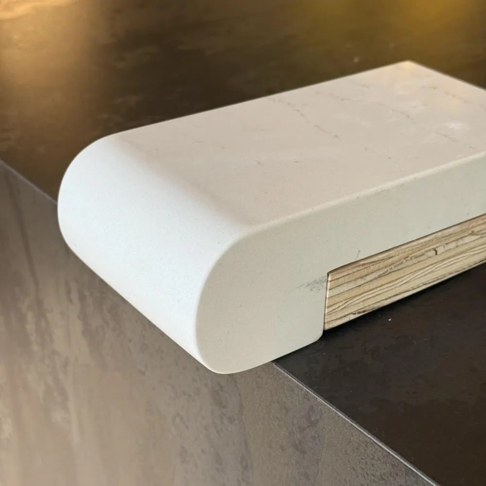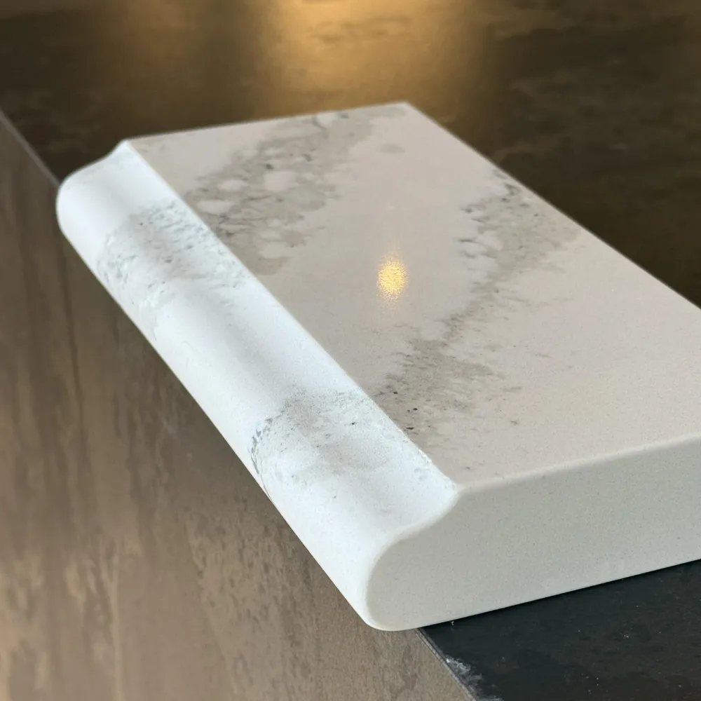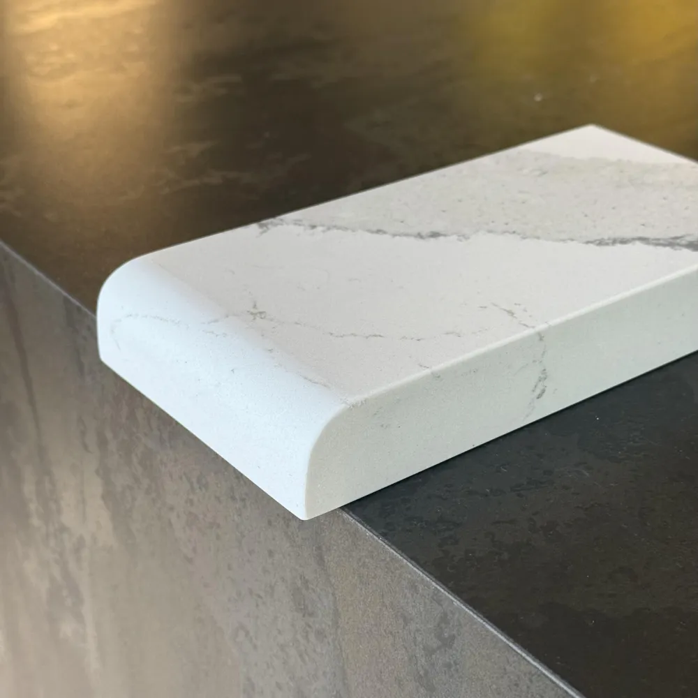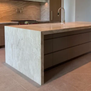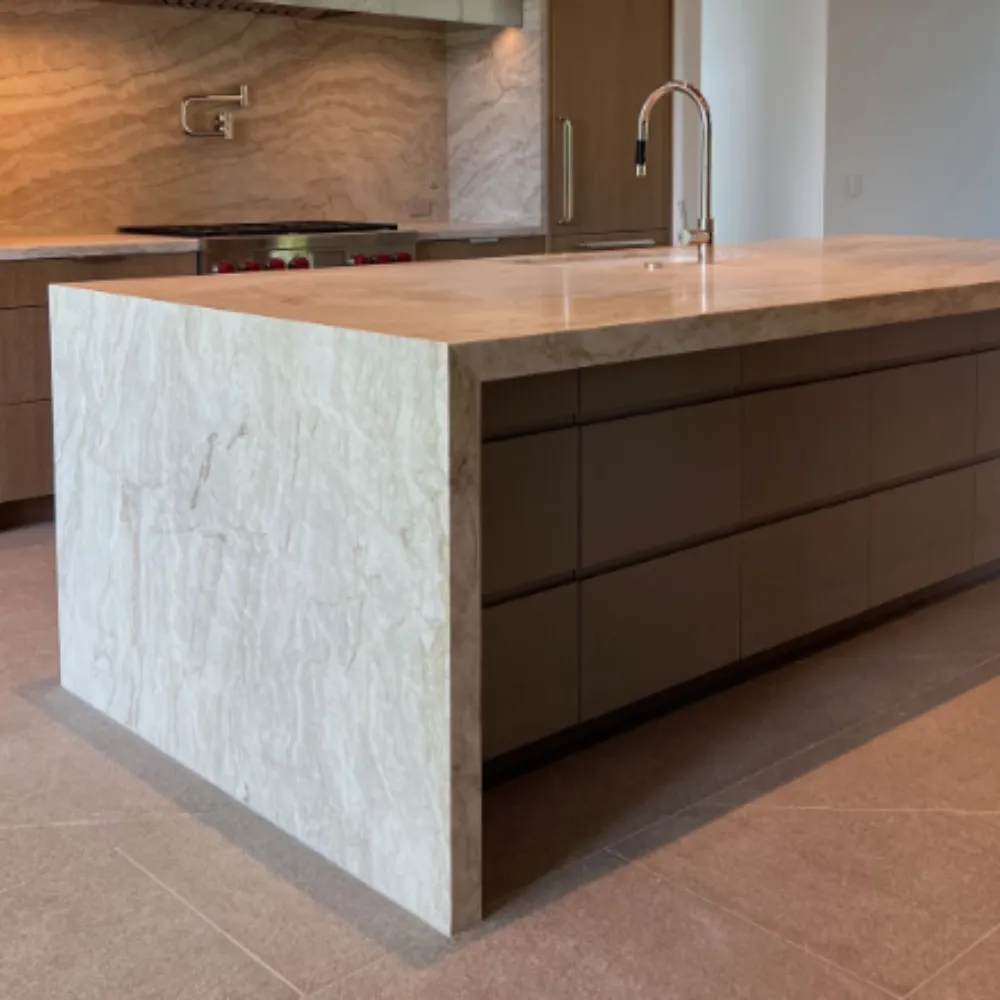A design where the countertop's edge extends down the side of the cabinets, creating a smooth, flowing look. The stone "falls" to the floor. Best for modern, minimalist designs, especially in kitchens with an island. It works well with materials like quartz and marble.